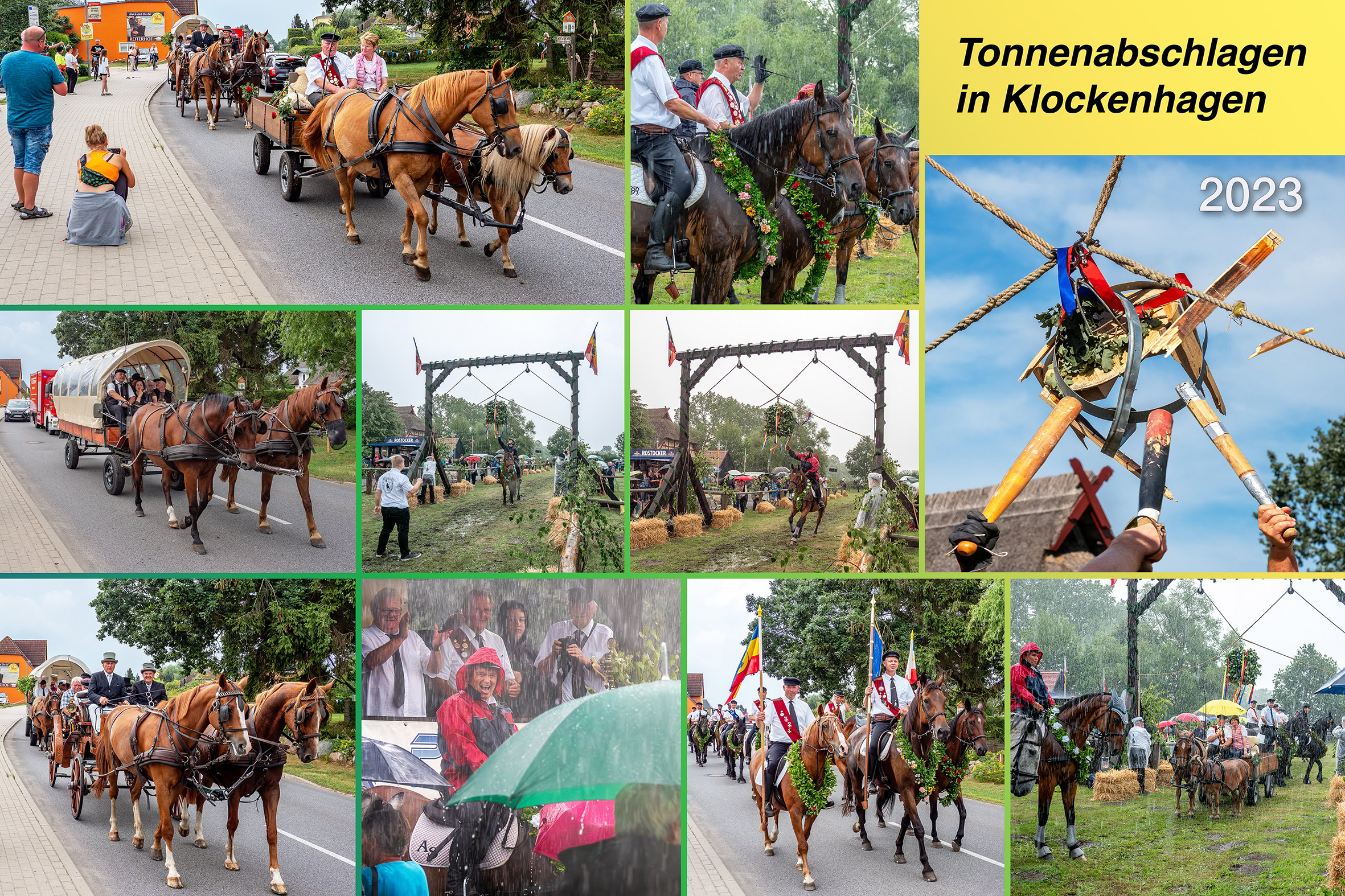 Traditioneller Pferdesport - Starker Regenguss beim Reiten mit der Holzkeule gegen ein Heringsfass auf dem Gelände in Klockenhagen bei Ribnitz-Damgarten.