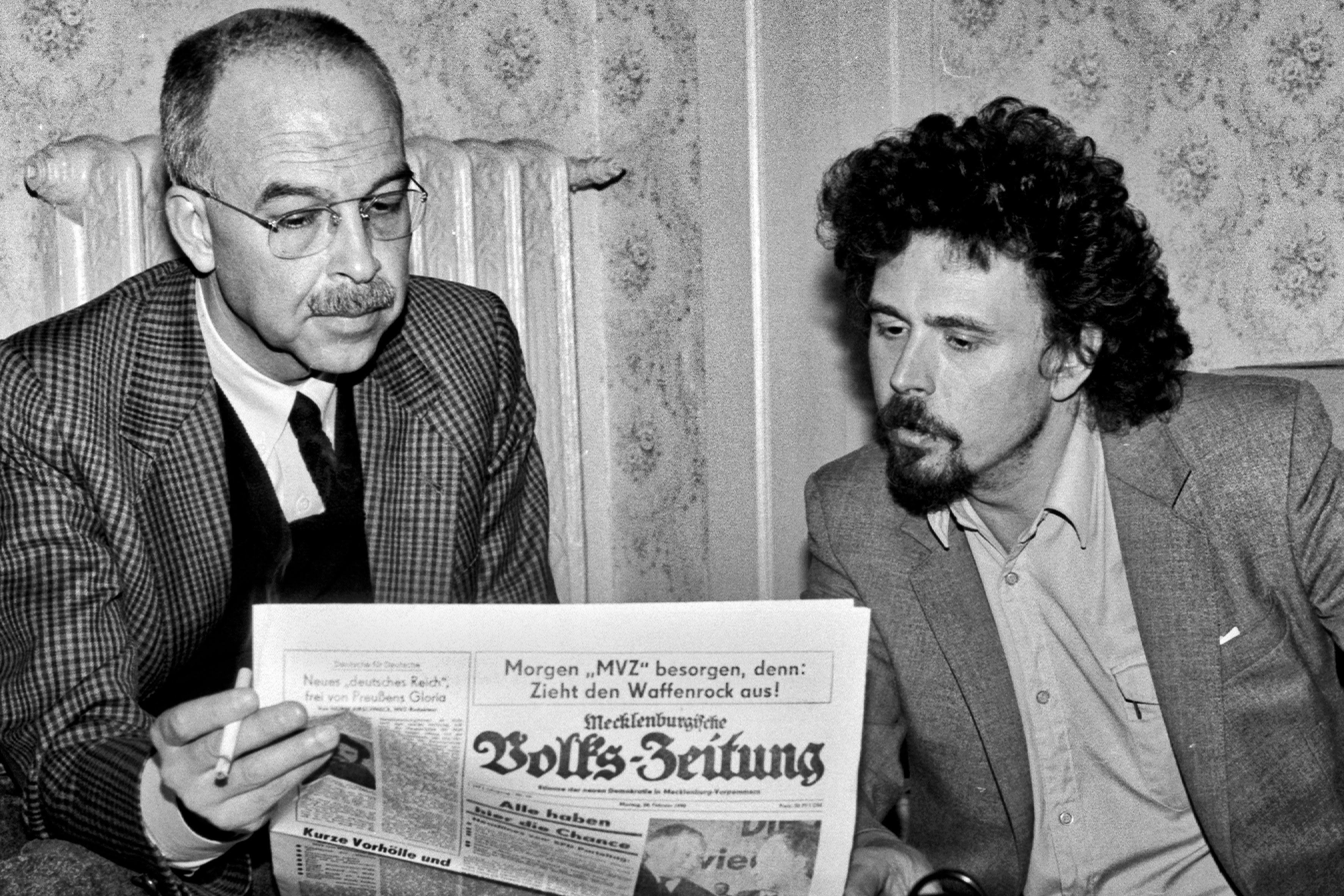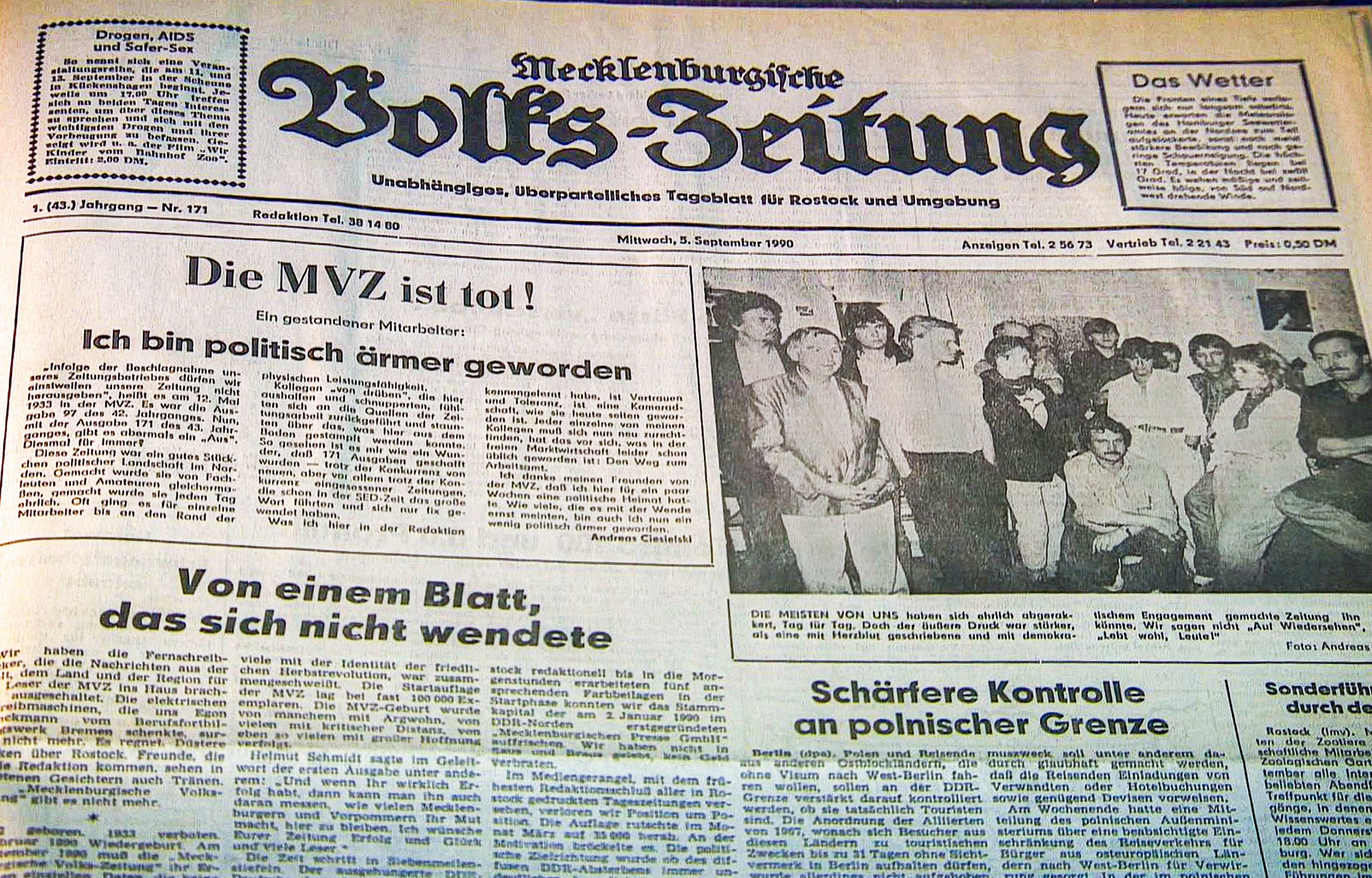 Die neue Zeitung kam erstmals erst am 15. Februar 1990 auf den Markt. Dann aber sollte es auch gleich ein Knaller sein: 100 000 Exemplare für ein Land - Mecklenburg-Vorpommern - das es pro forma noch gar nicht gab. Ganz bewusst stimmten wir auf Vorschlag der jungen revolutionsgeladenen Sozialdemokratie in einen alten Titel ein: Die Mecklenburgische Volks-Zeitung (MVZ) sollte es sein, jene „Tages-Zeitung des schaffenden Volkes für beide Mecklenburg”, die 1892 im Rostocker SPD-Haus Doberaner Straße 6 das Licht der Welt erblickte und am Freitag, dem 12. Mai 1933, von den Nazis am Ende der Demokratie, im Zuge der Gleichschaltung verboten wurde.