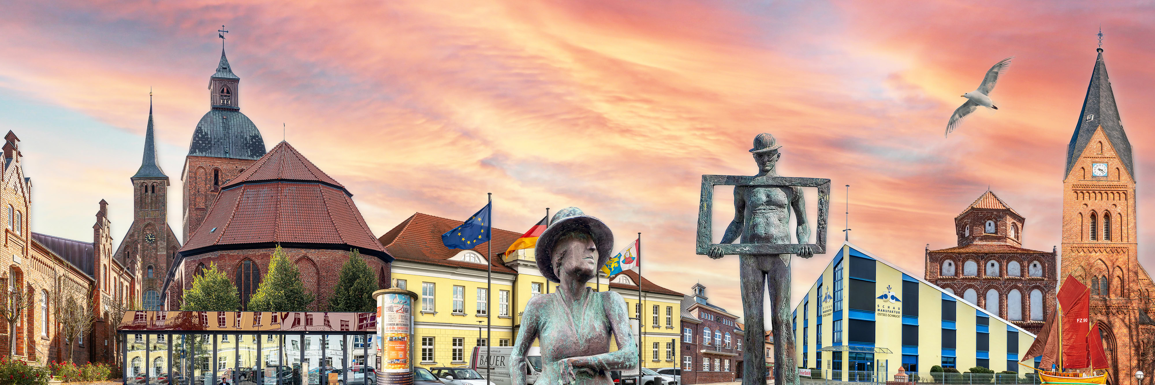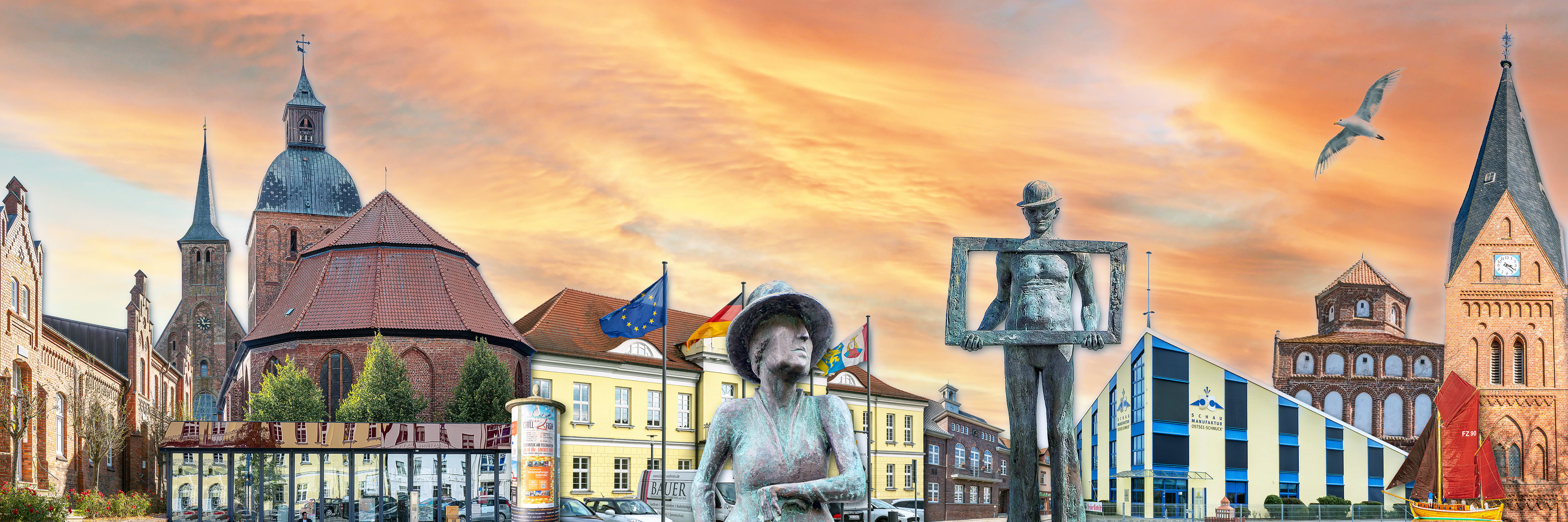 Diese aus mehreren Fotografien komponierte Skyline vereint markante Wahrzeichen von Ribnitz-Damgarten: das Klarissenkloster mit Bernsteinmuseum, die Marienkirche mit dem Restaurant Paganini, die Bronzefigur der Stiftsdame Olga von Oertzen, das Rathaus, eine Litfaßsäule, den Stelzenläufer der Figurengruppe „Der Zirkus kommt“, die Schaumanufaktur Ostseeschmuck, ein Zeesboot auf dem Bodden sowie die Bartholomäuskirche in Damgarten. Die Illustration entstand im Zuge eines gestalterischen Entwicklungsprozesses mit Unterstützung meines Mentors Andreas Dietzel von Nord Design.