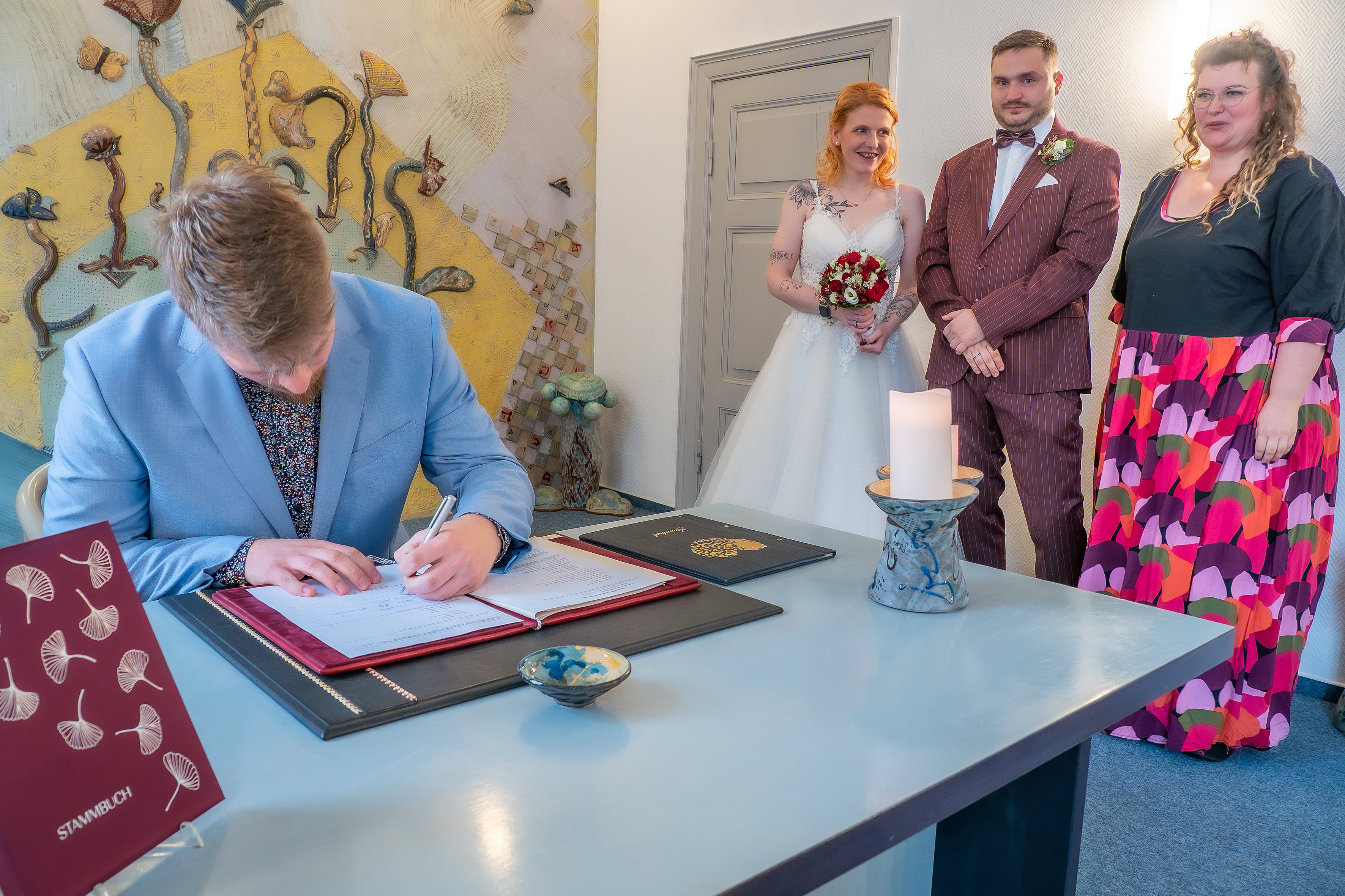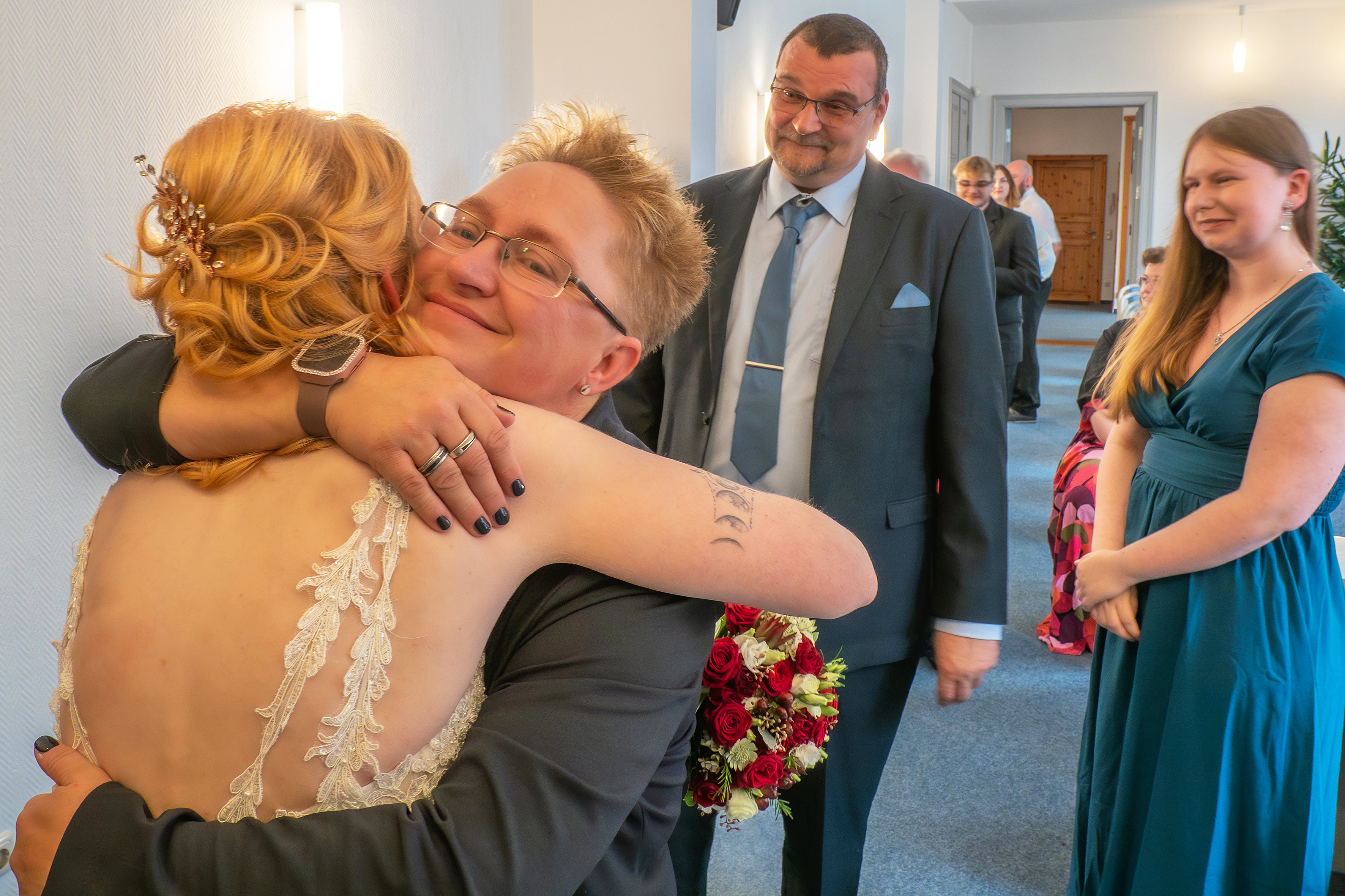 Manche Hochzeiten erzählen ihre Geschichte ganz von selbst – so wie die von Sophie & Jean-Pièrre im Standesamt Ribnitz-Damgarten am 25.10.2025. Schon der Ablauf war voller Spannung: Der Bräutigam und die gesamte Hochzeitsgesellschaft bekamen die Braut vor der Trauung nicht zu Gesicht. Sophie wurde von ihrer Brautzeugin wie ein gut gehütetes Geheimnis direkt bis vor das Standesamt chauffiert. Ein alter Hochzeitsglaube besagt: Wer die Braut vor dem Beginn der feierlichen Zeremonie im Brautkleid sieht, bringt Unglück.
