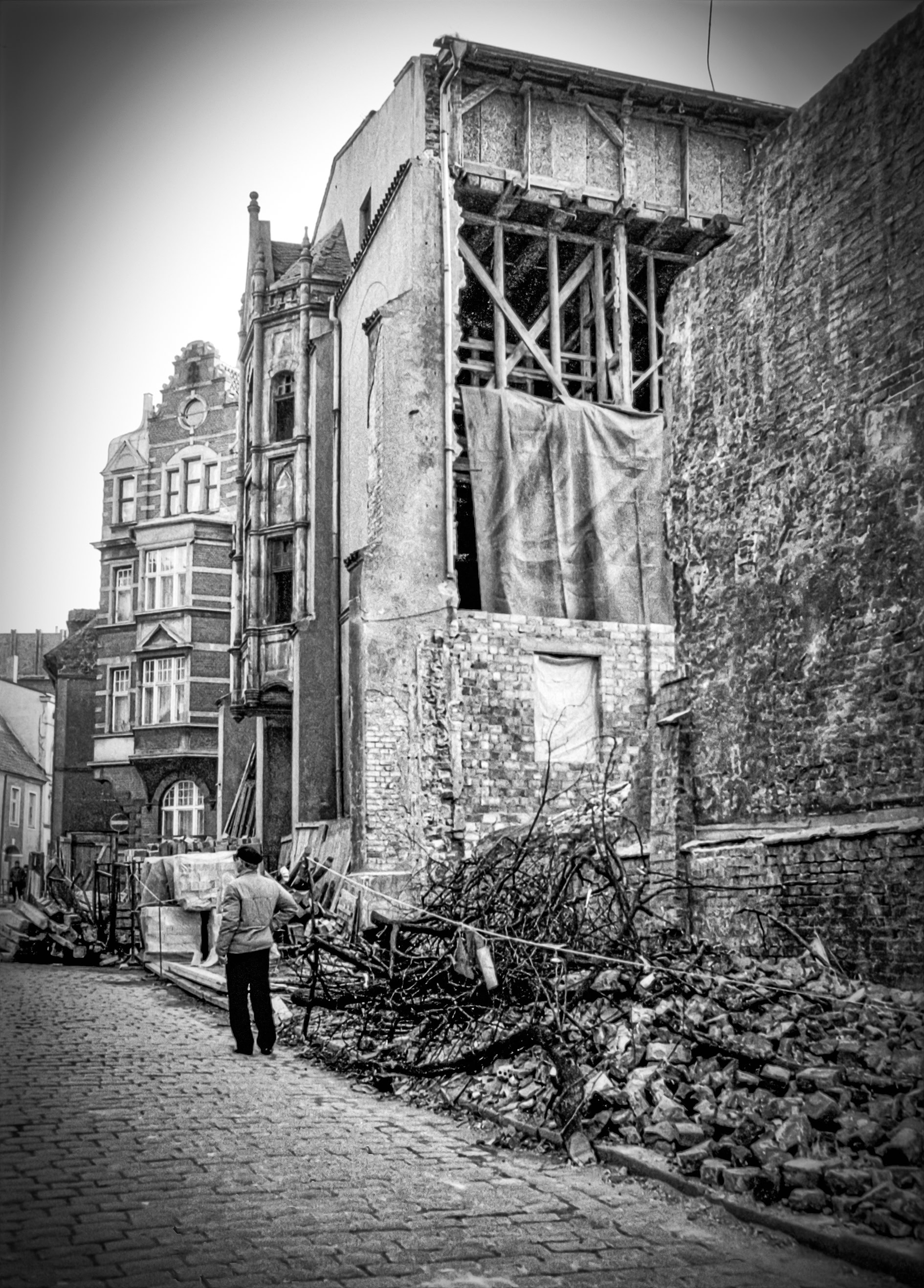 Die Folgen des wirtschaftlichen Niedergangs der DDR und die Auswirkungen der sozialistischen Planwirtschaft beim Wohnungsbau und der Verfall der Altbausubstanz sind auch in Stralsund zu sehen. Die Fotos entstanden im Februar 1990.