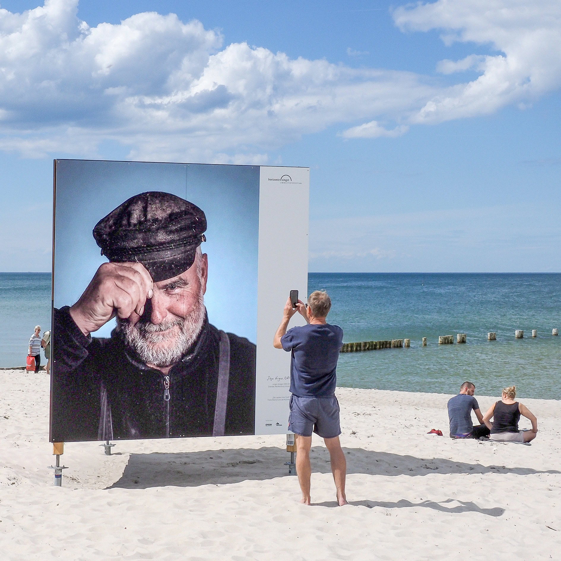Trotz Absage des 14. Umweltfotofestivals HORIZONTE Zingst 2021 wegen Corona wurden die meisten Indoor- und Open-Air Ausstellungen im Stadtbild gezeigt. Dieses Foto zeigt die Installation „Die Letzten ihrer Zunft“ am Strand. An dem Projekt der Fotografen Franz Bischof und Jan Kuchenbecker beteiligten sich 228 Küstenfischer. Zu sehen war die Auswahl von 33 Portraits aus dem Bildband SEESUCHT.